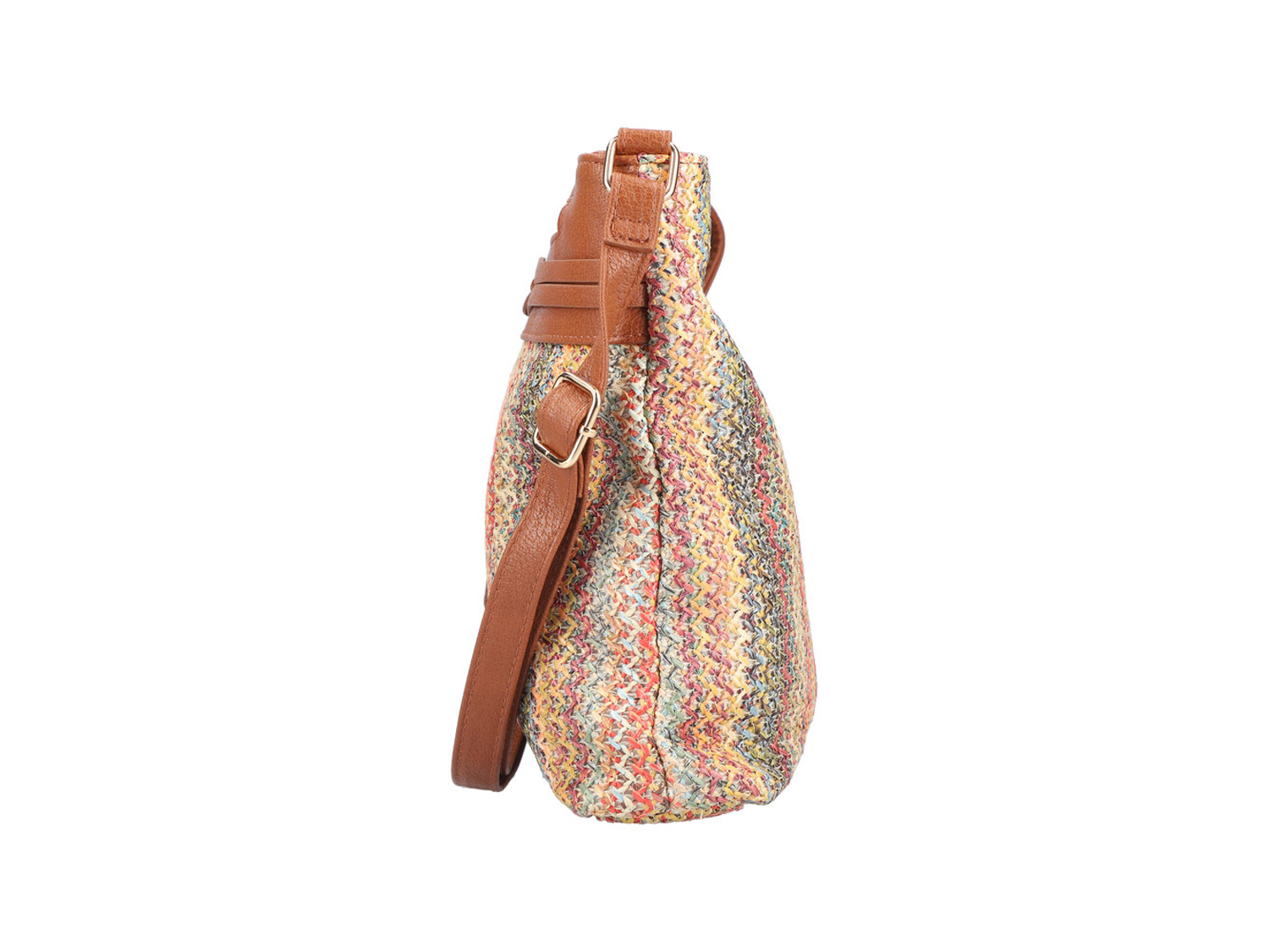 Stauraum trifft auf sommerliches Design! Diese cognacfarbene Handtasche mit farbenfroher Bastoptik ist nicht nur ein stylisches Highlight, sondern auch unglaublich praktisch. Das Hauptfach ist in zwei gleich große Fächer unterteilt, die jeweils separat mit Reißverschluss geschlossen werden können. Zusätzlich gibt es ein Außenfach vorne, ein Reißverschlussfach hinten und zwei Einsteckfächer im vorderen Hauptfach. Der verstellbare Schulterriemen sorgt für flexibles Tragen.