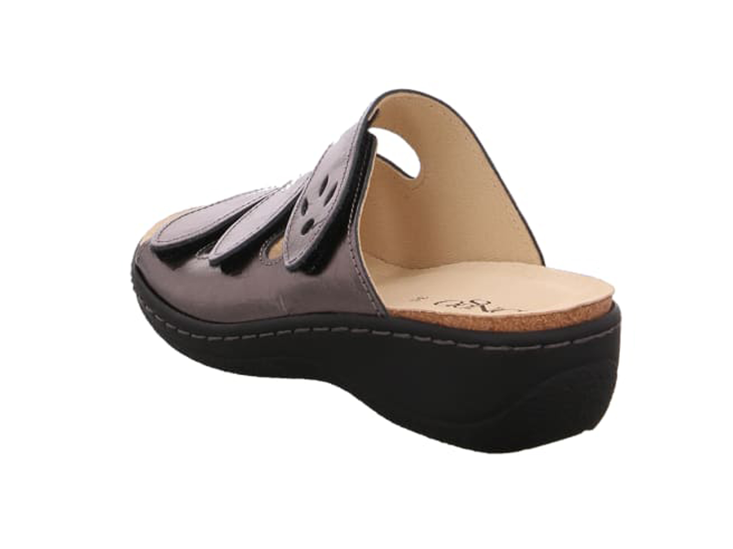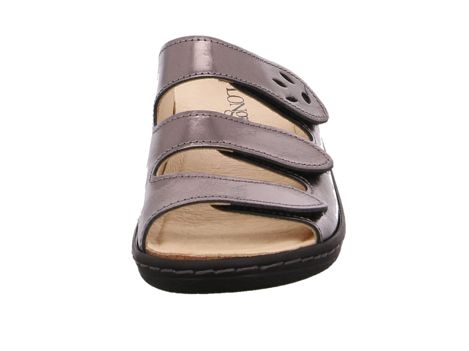 Damen Pantoletten von Longo aus weichem Leder. Als Innenfutter wurde cromfrei gegerbtes Leder verwendet. Die PU-Sohle schont die Gelenke. Die drei Klettverschlüsse zum einfachen und bequemen An- und Ausziehen bieten perfekten Halt und sind stufenlos verstellbar.