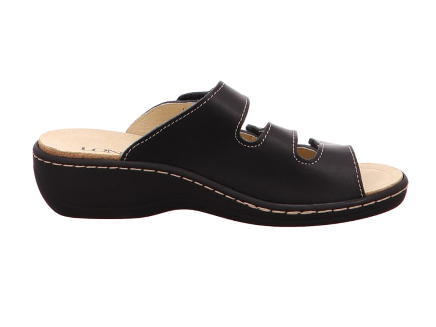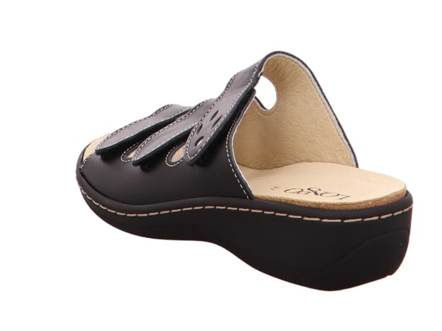 Damen Pantoletten von Longo aus weichem Leder. Als Innenfutter wurde cromfrei gegerbtes Leder verwendet. Die PU-Sohle schont die Gelenke. Die drei Klettverschlüsse zum einfachen und bequemen An- und Ausziehen bieten perfekten Halt und sind stufenlos verstellbar.