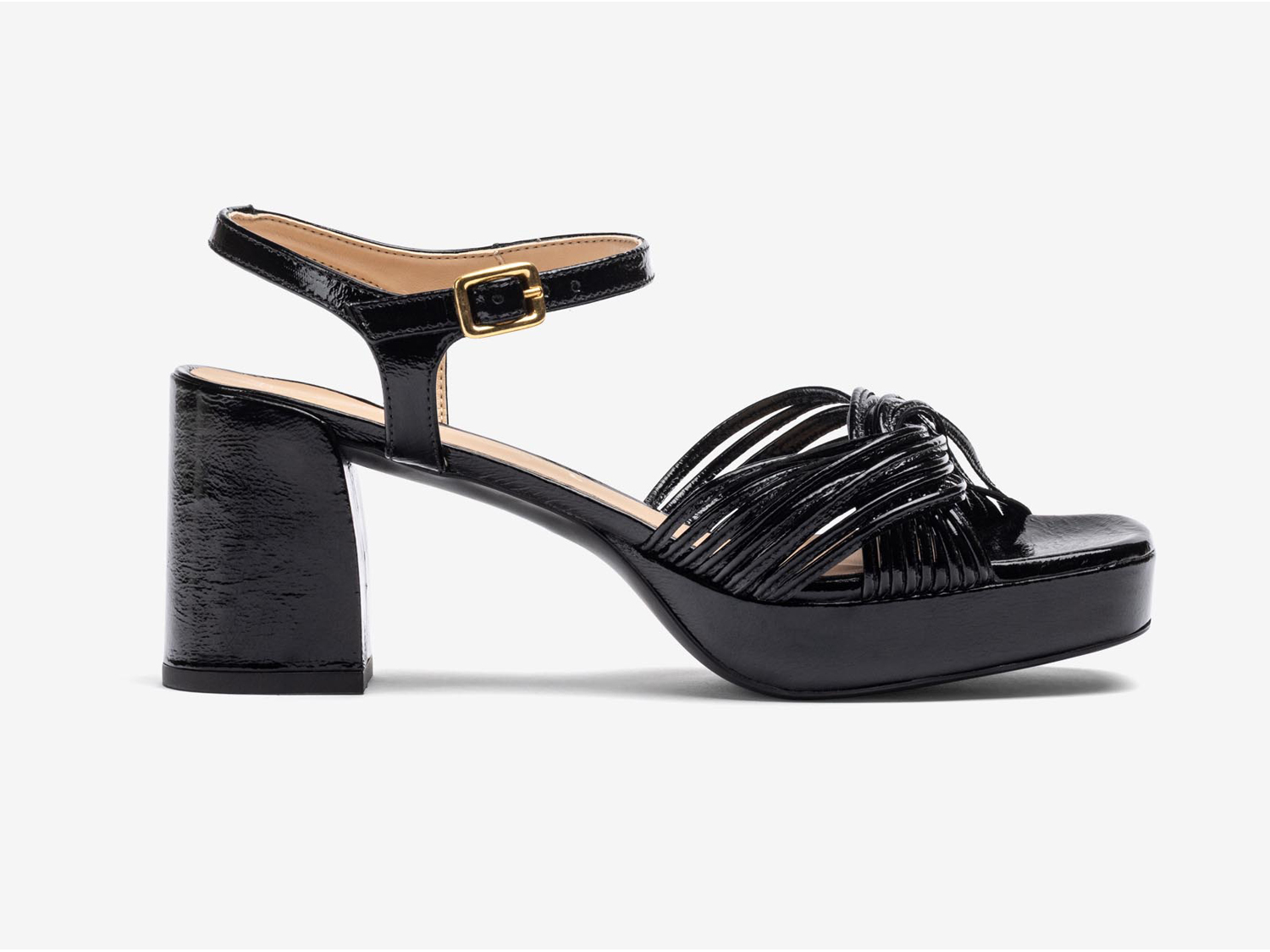 Sandalen aus Knautschlackleder mit eckiger Zehenpartie. Feine Lacklederriemchen im vorderen Bereich. 2,5 cm hohes Plateau und 7 cm Absatz, farblich passend bezogen. Am Knöchel mit einer Metallschnalle zu verstellen. Rutschfeste Gummisohle. Die perfekten Sandalen, um jedem Look das gewisse Etwas zu verleihen.