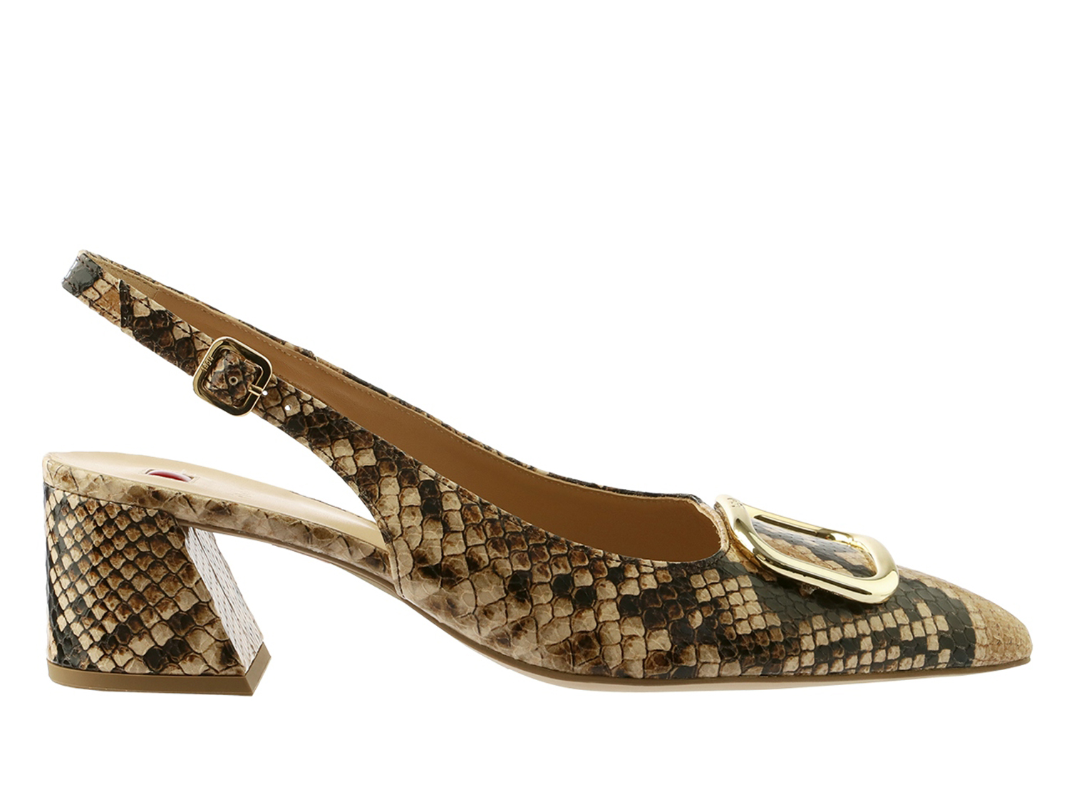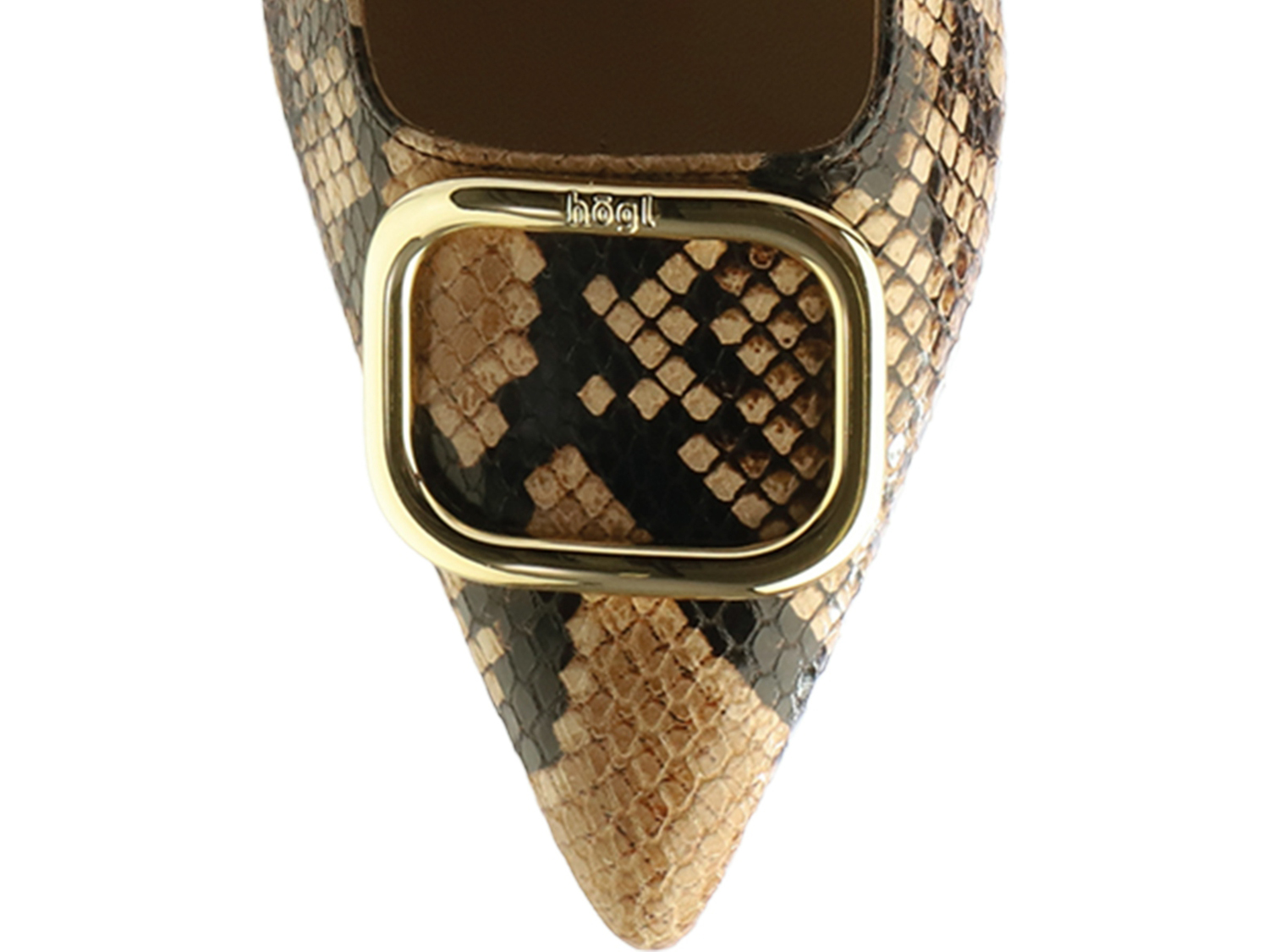Klassische Silhouette trifft bei den Högl Slingback-Pumps Jennifer auf ausdrucksstarke Details und Materialien. Softes Leder in brauner Schlangenprägung verzaubert mit exotischem Touch, während der goldene Frame und der abgeschrägte Blockabsatz feminine Eleganz in das Design einbringen. Mit der dezenten Schnalle am Fersenriemen lässt sich die Passform individuell einstellen. Herrlich weich und leicht fühlt sich der Schuh dank Lederfutter und Weichpolsterung der Sohle an. Kombinieren Sie den Eyecatcher zu monochromen Looks in Schwarz, Creme oder Beige. Ein perfekter Begleiter ist die Schultertasche