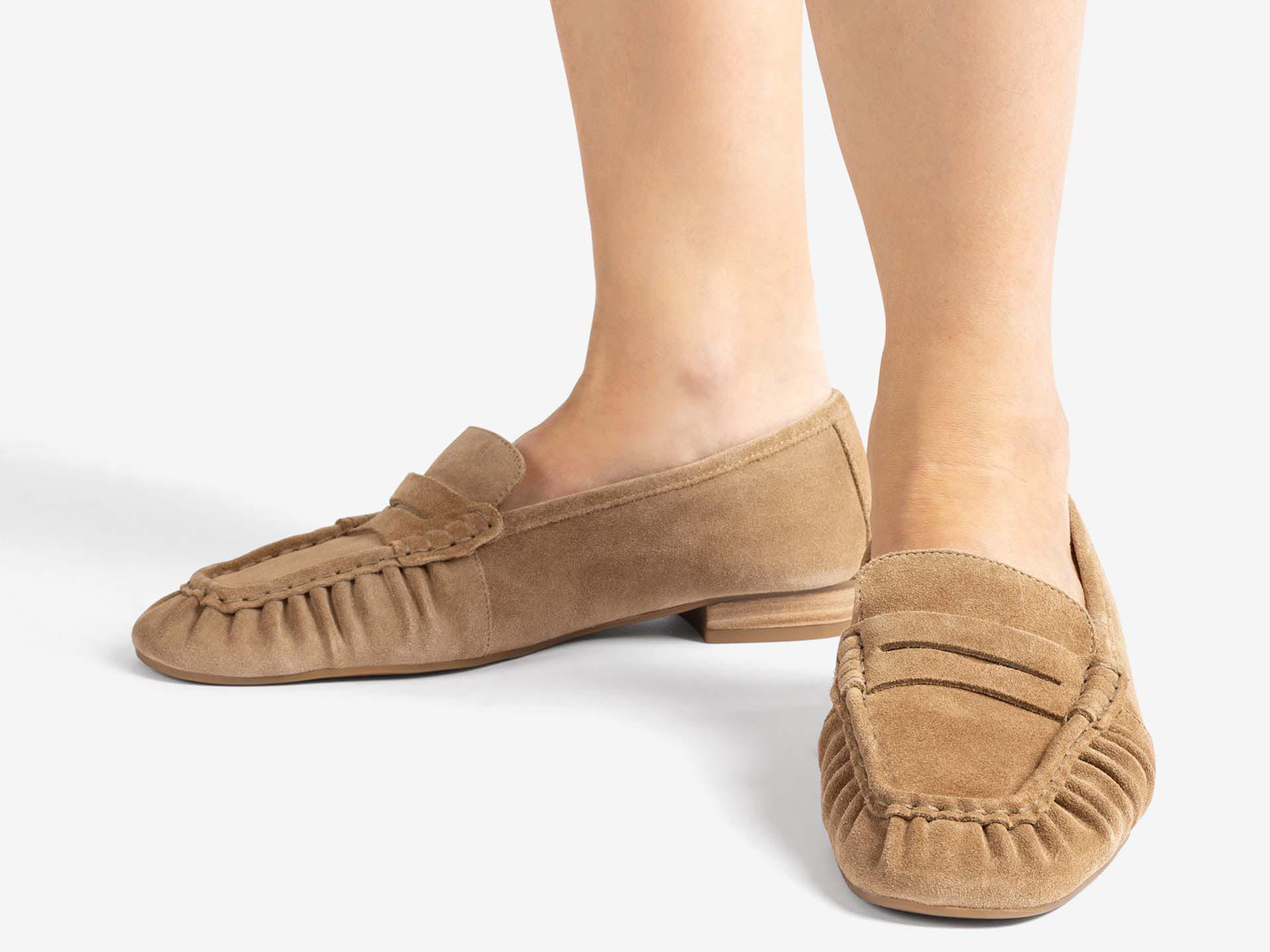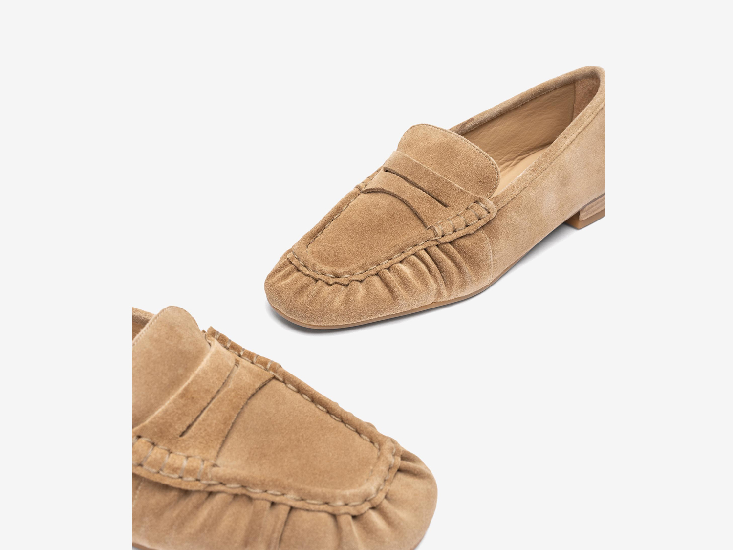 Loafer aus Wildleder mit eckiger Kappe. Auf dem Vorderblatt mit gerafftem Leder verziert. Weiches Futter und zusätzliche Dämpfung in der Sohle für mehr Komfort. Niedriger Absatz in Holzoptik. Leichte, flexible und rutschfeste Gummisohle. Die perfekte Wahl für einen modernen, lässigen und unverwechselbaren Look.