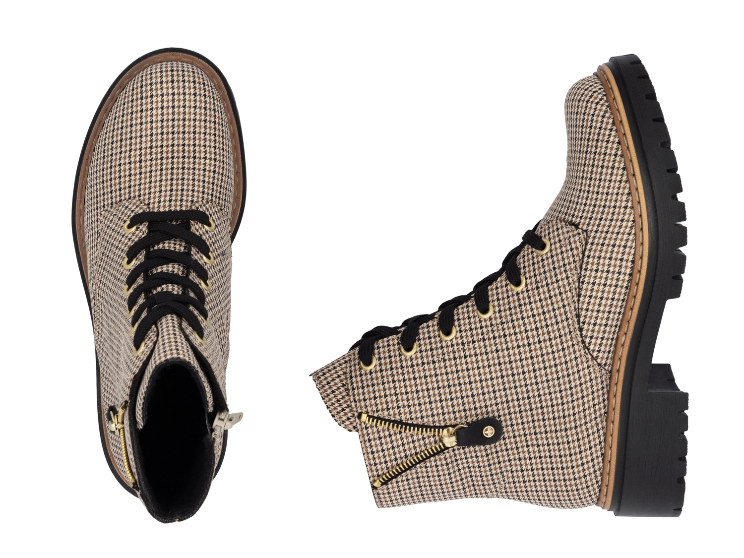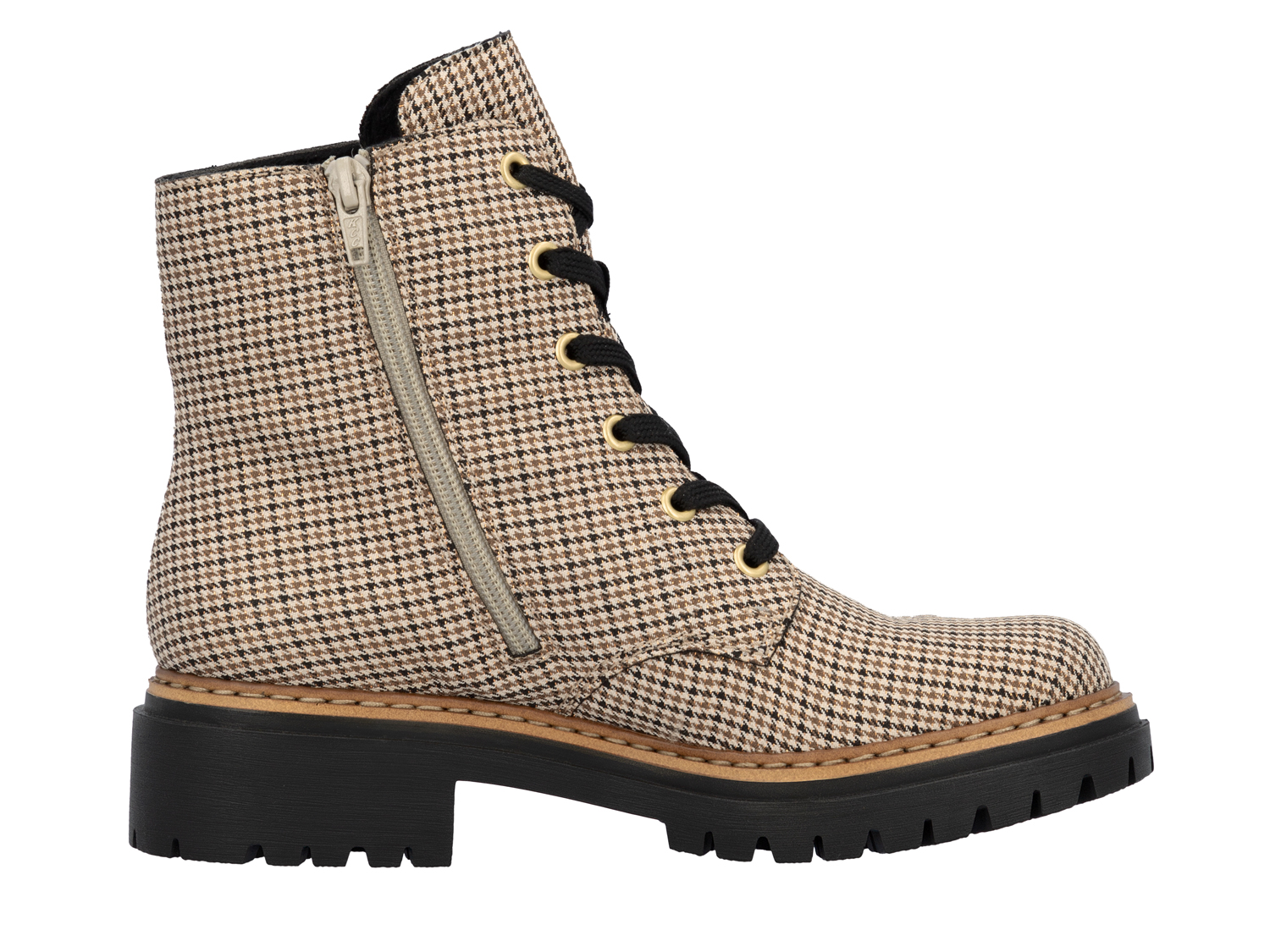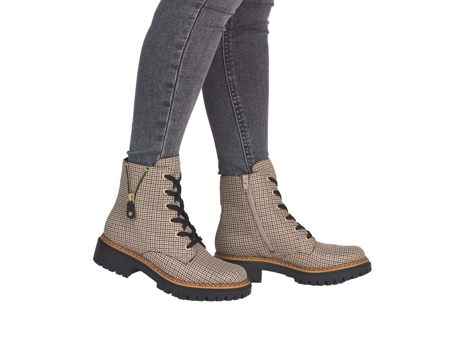 Cool, lässig! Diese beigen Rieker Biker Boots für Damen garantieren ein himmlisches Tragegefühl. Dank der Anflechter-Machart ist dieser Schuh besonders widerstandsfähig und flexibel. Die clevere Kombination aus Schnürung und Reißverschluss gibt optimalen Halt und ermöglicht ein einfaches An- und Ausziehen. Das modische Karomuster ist ein hübsches Detail. Die leichte und schockabsorbierende Sohle bietet anhaltendes Wohlgefühl %u2012 auch an langen Tagen. Ein weiteres Plus ist die extra weiche Decksohle. Deine Best-Buddies für die neue Saison!